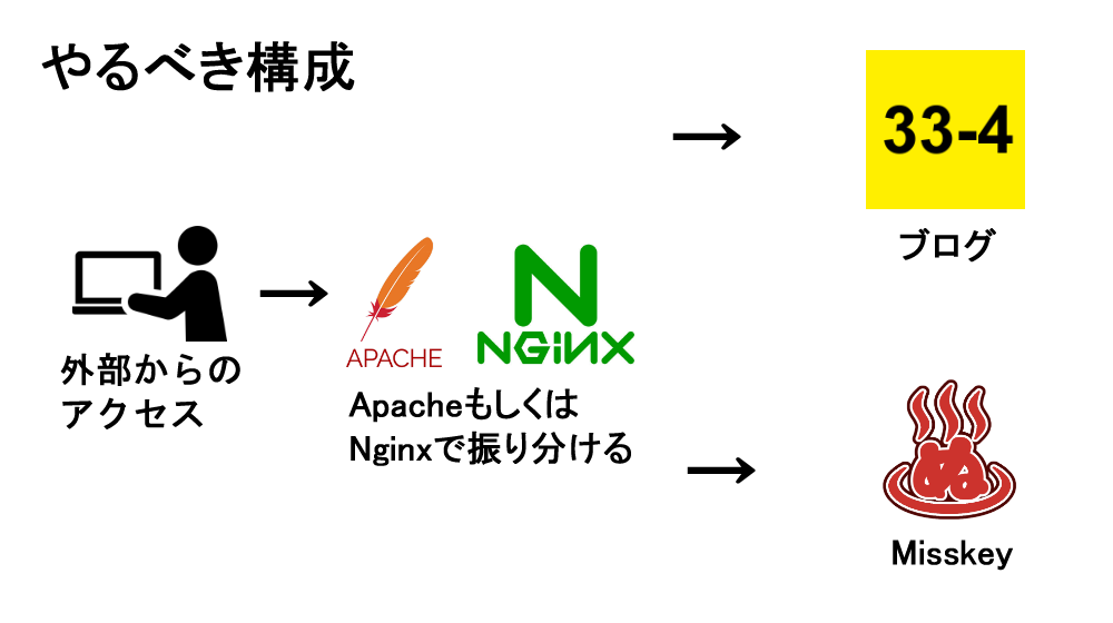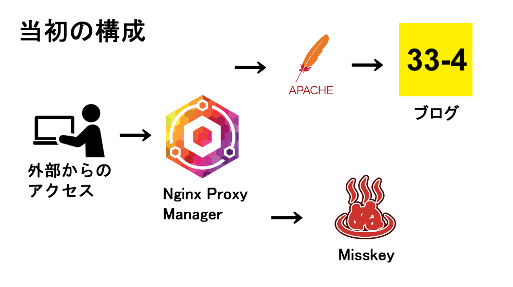 Apacheはサーバーのコントロールパネルに付属していたものであり、ここを下手にいじるのは良くないし、これなら簡単に設定できるだろうと安易に考えてDockerでNPMをインストールしましたが、詳細な設定を行うのが難しくてアクセスを適切に振り分けられなかった上、ブログへのアクセスがNPM→Apacheとリバースプロキシの機能が重複していたりと煩雑でセキュリティホールが生まれやすい環境になってしまっていました。